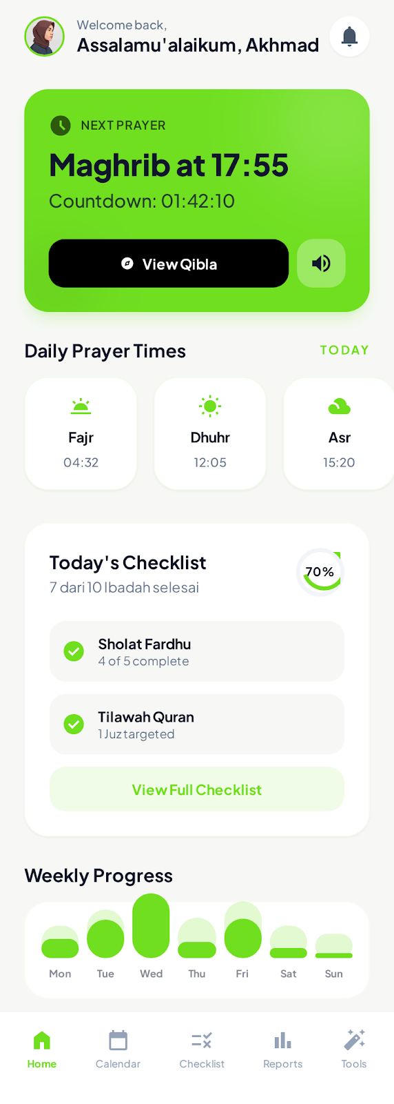 - Murattal: Spotify-style 5-button controls [Shuffle, Prev, Play, Next, Playlist] - Murattal: Animated 7-bar equalizer visualization in player circle - Murattal: Unsplash API background with frosted glass player overlay - Murattal: Transparent AppBar with backdrop blur - Murattal: Surah playlist bottom sheet with full 114 Surah list - Murattal: Auto-play disabled on screen open, enabled on navigation - Murattal: Shuffle mode for random Surah playback - Murattal: Photographer attribution per Unsplash guidelines - Dashboard: Auto-scroll prayer schedule to next active prayer - Fix: setState lifecycle errors on Reading & Murattal screens - Setup: flutter_dotenv, cached_network_image, url_launcher deps