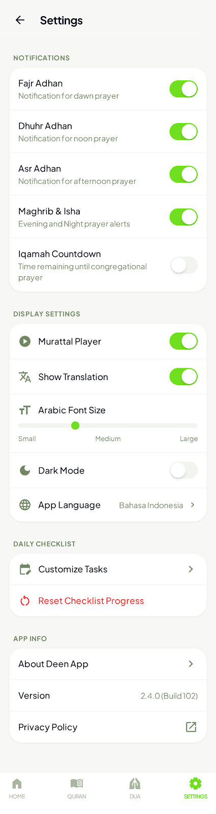 - Murattal: Spotify-style 5-button controls [Shuffle, Prev, Play, Next, Playlist] - Murattal: Animated 7-bar equalizer visualization in player circle - Murattal: Unsplash API background with frosted glass player overlay - Murattal: Transparent AppBar with backdrop blur - Murattal: Surah playlist bottom sheet with full 114 Surah list - Murattal: Auto-play disabled on screen open, enabled on navigation - Murattal: Shuffle mode for random Surah playback - Murattal: Photographer attribution per Unsplash guidelines - Dashboard: Auto-scroll prayer schedule to next active prayer - Fix: setState lifecycle errors on Reading & Murattal screens - Setup: flutter_dotenv, cached_network_image, url_launcher deps